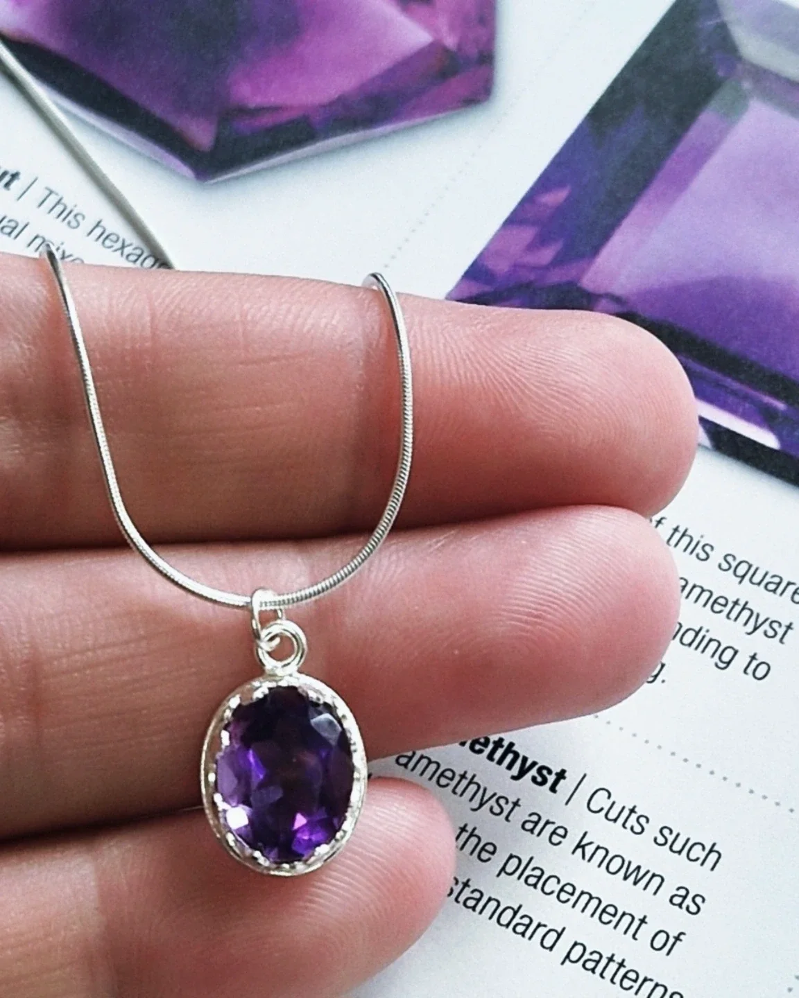 Beautiful deep purple amethyst gemstone necklace set into sterling silver and on a 20inch sterling silver snake chain.