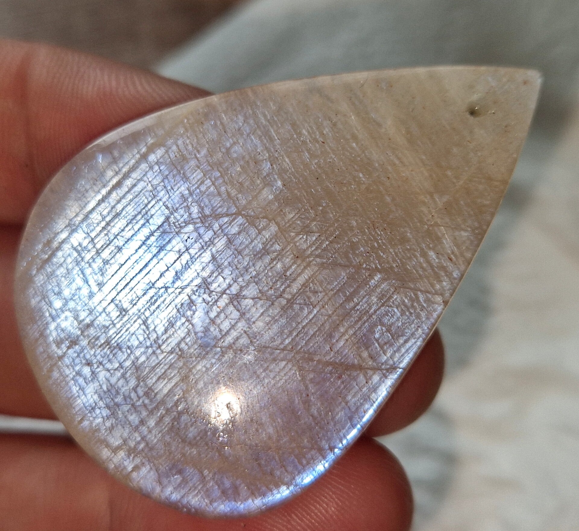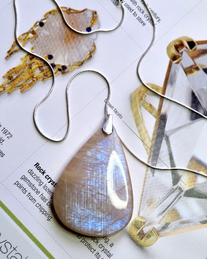 It is a natural combination of moostone & sunstone,exibiting a silvery sheen with flashes of blue,often hints of orange from the sunstone.