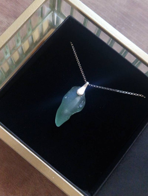 Very nice green shade sea glass hand drilled and on an 18inch sterling silver chain.