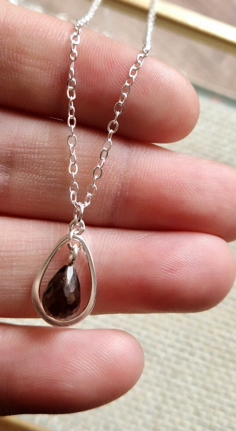 Sterling silver necklace with a small smoky quartz faceted crystal dangling from a silver frame.