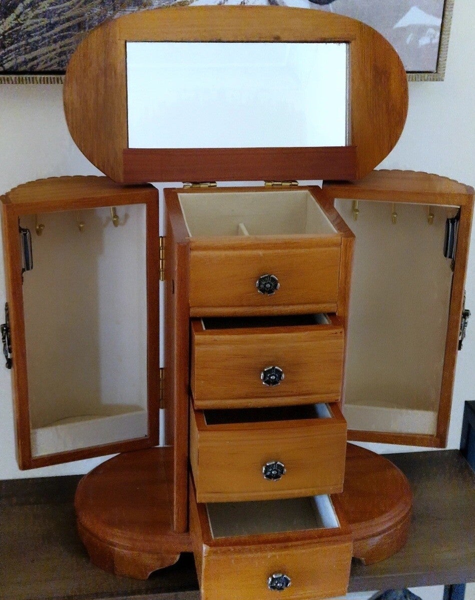Two side door openings for necklaces & bracelets, top mirror and four drawer compartments.