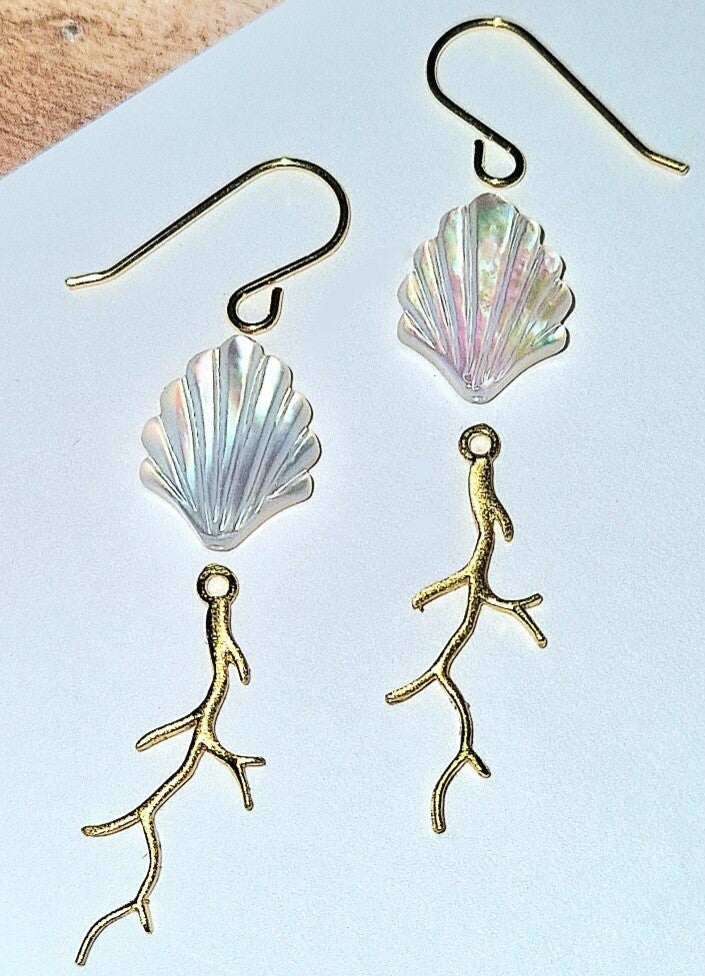 Mother of pearl earrings with gold filled ear hooks and gold filled coral hanging charms.
