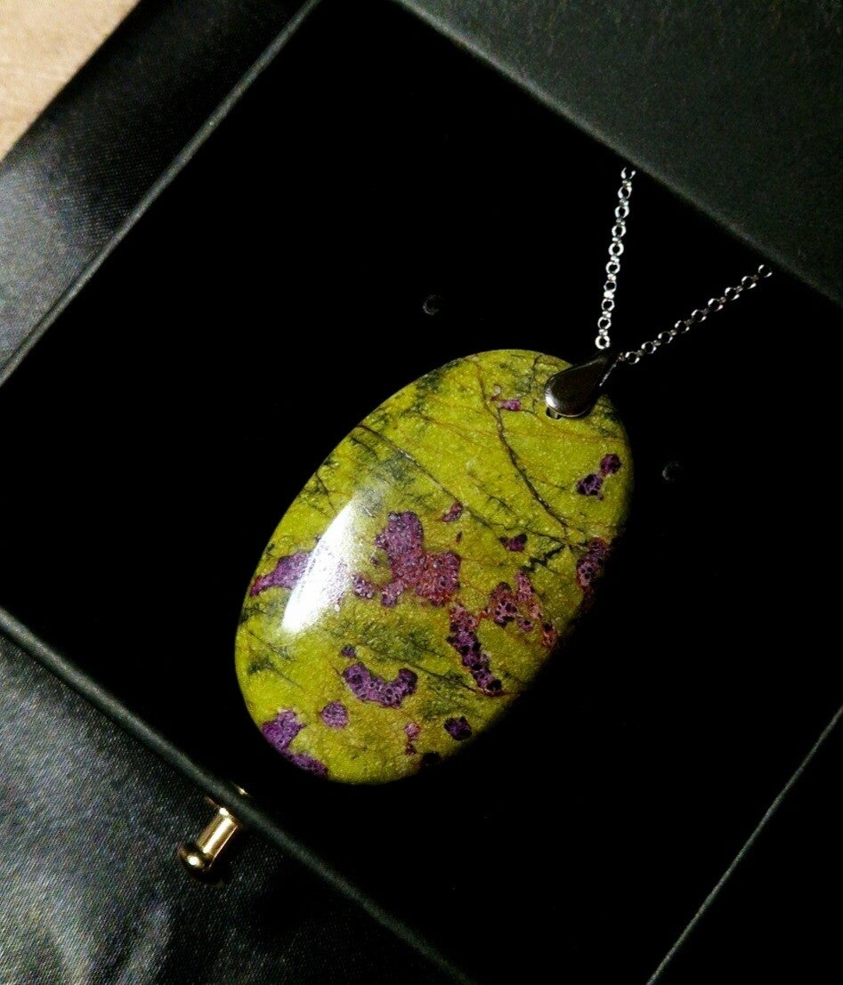 Very nice hand drilled stichtite cabochon on 18inch sterling silver chain.