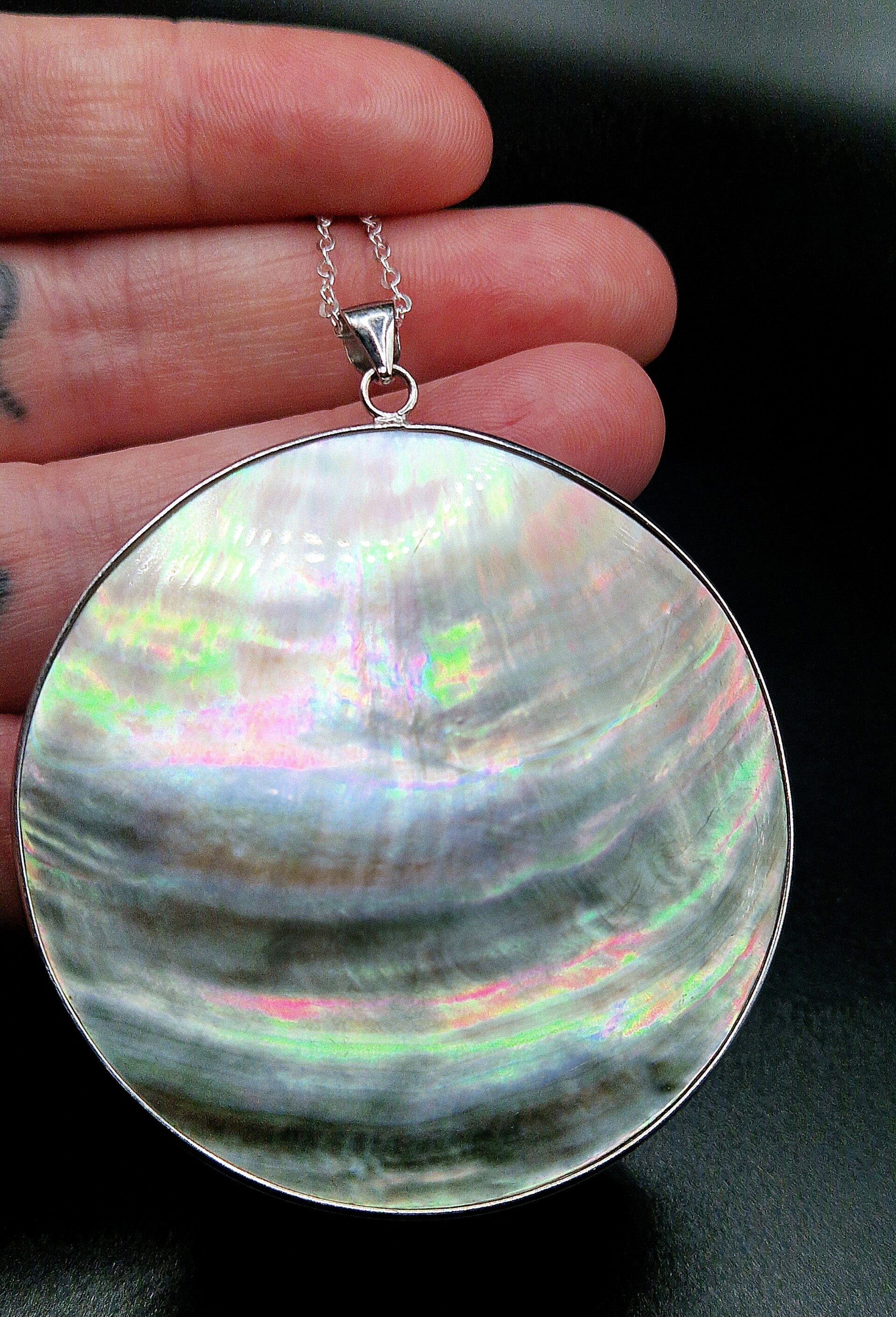 Abalone shell necklace on sterling silver 18inch chain with amazing iridescent colors.