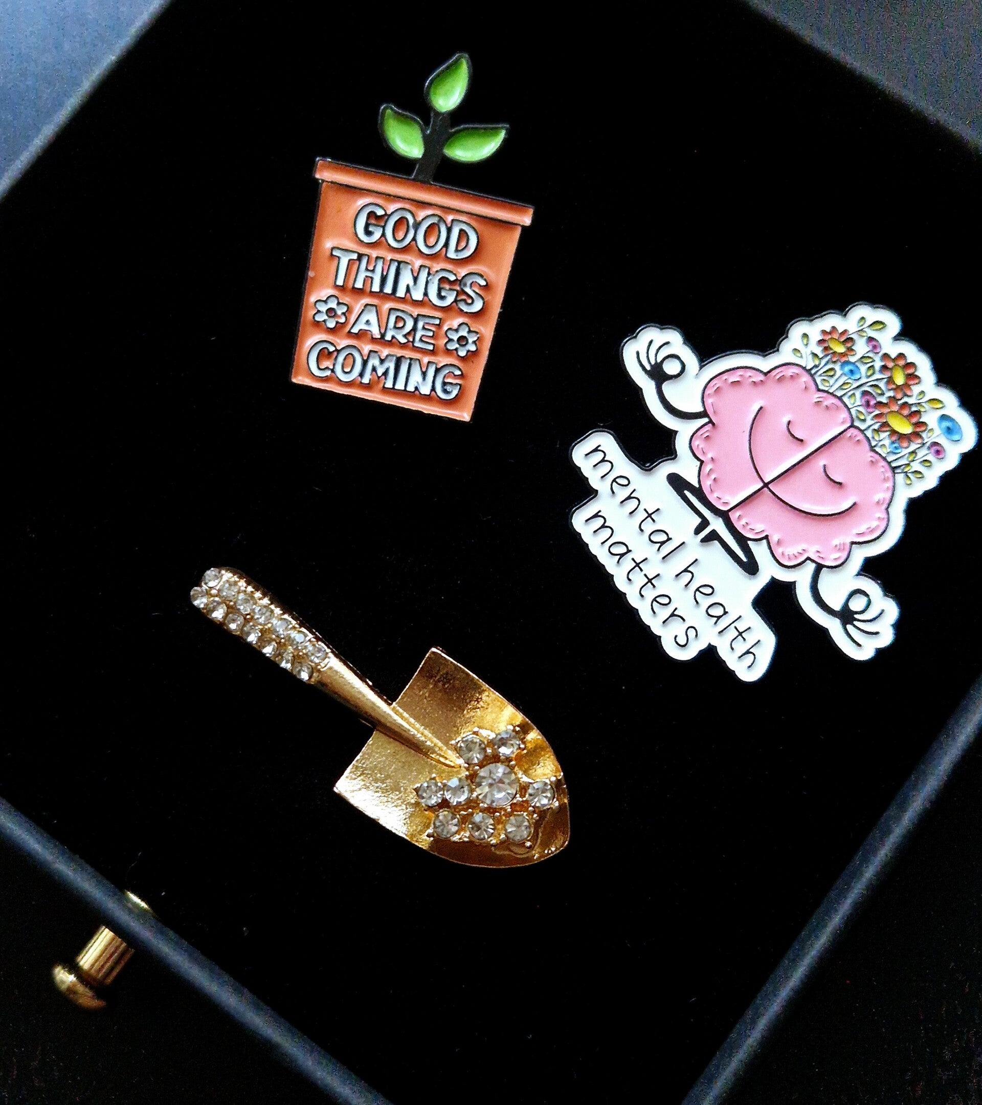 Trio of pin brooches including mental health brooch, spade with diamonds and plant pin brooch.