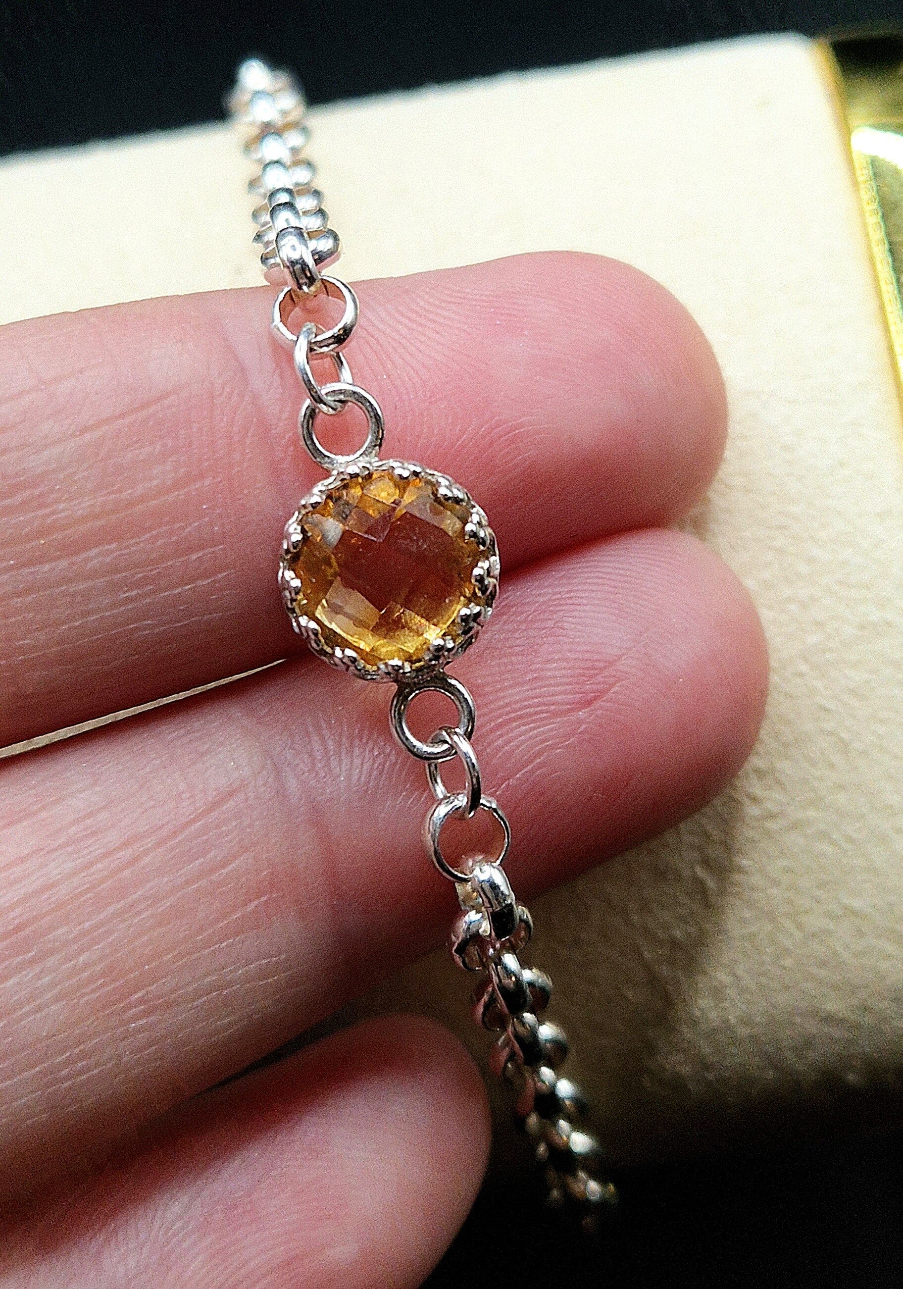 Faceted coin/round citrine set into sterling silver and on a belcher silver bracelet.