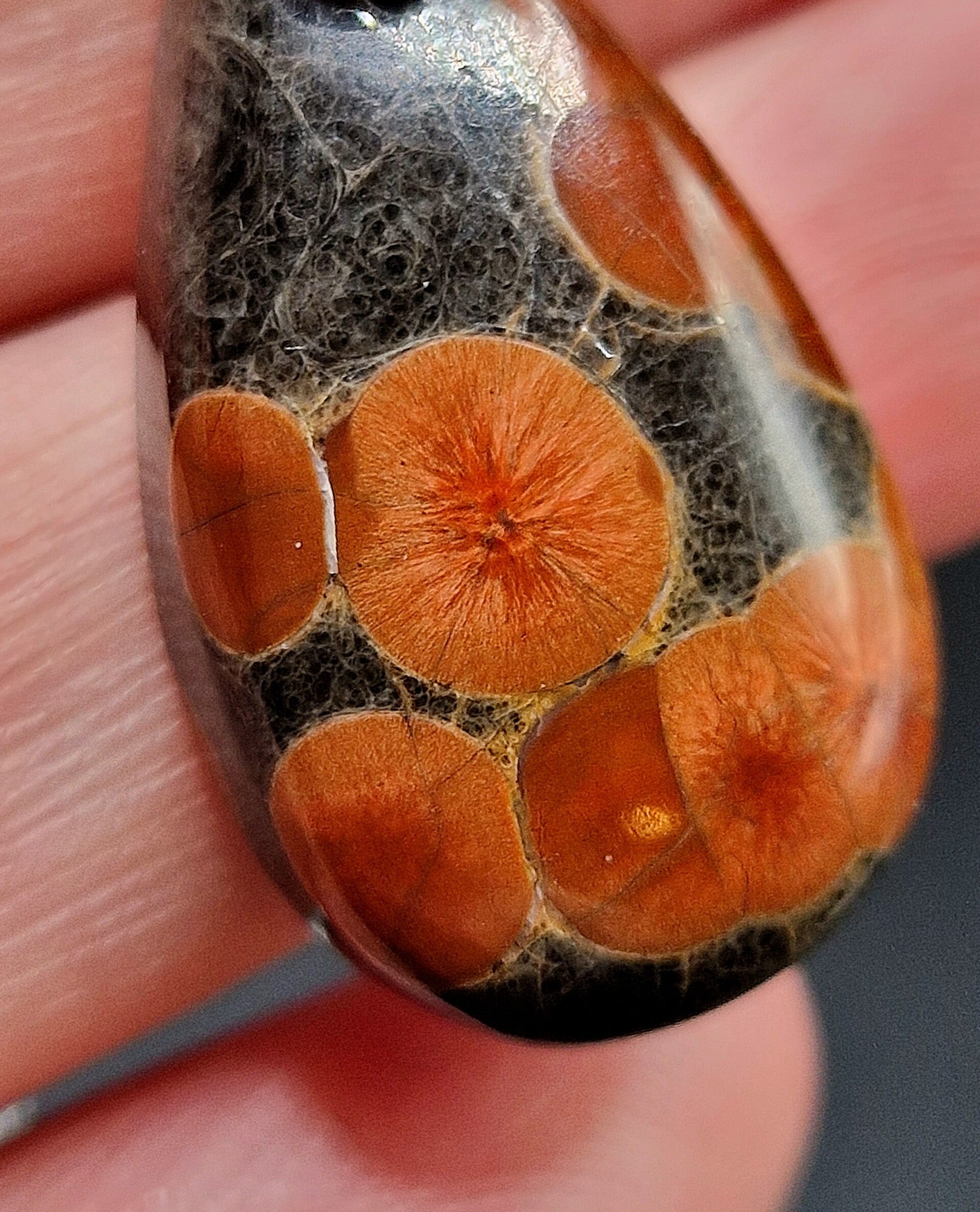 Peanut obsidian is a rare usually Mexican, variety of volcanic glass featuring gray, black or brown matrixes with red-orange, peanut- shaped feldspar inclusions stained by hematite. Known for grounding & emotional healing, it is used in jewelry, as worry stones, and in meditation.
