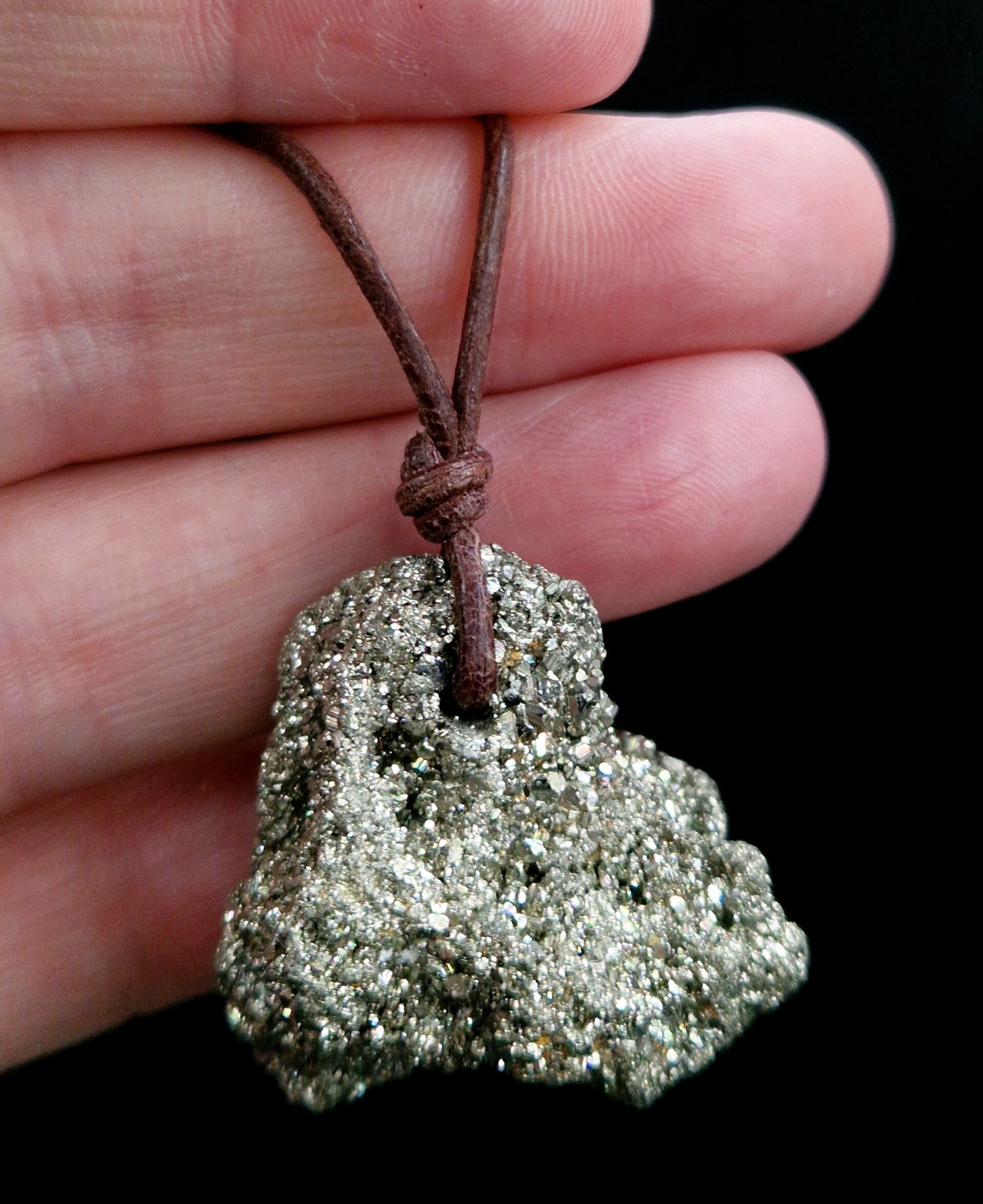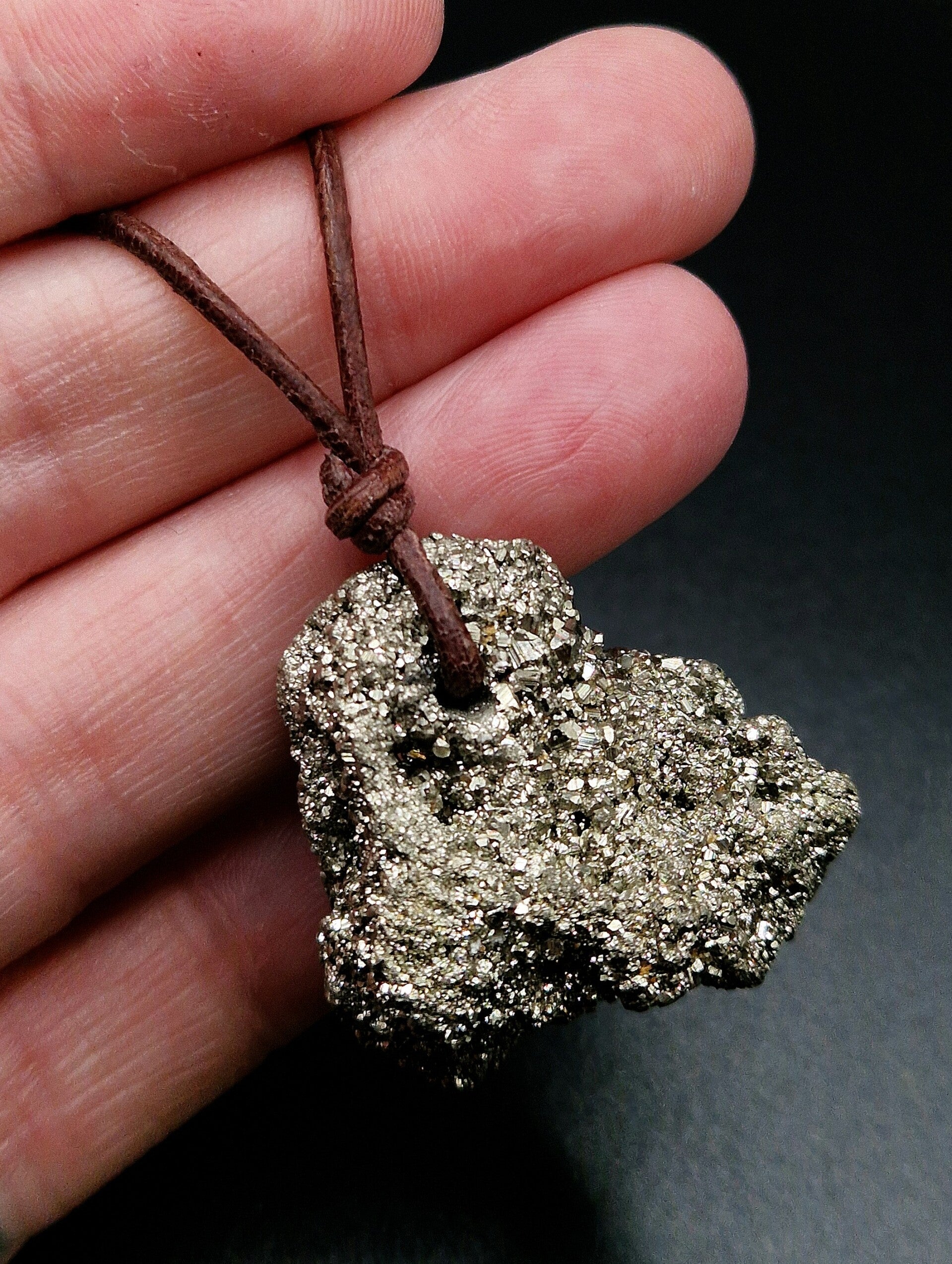 Very nice peruvian pyrite , drilled and on brown leather hand tied cord. Peruvian pyrite is some of the best pyrite in the world.
