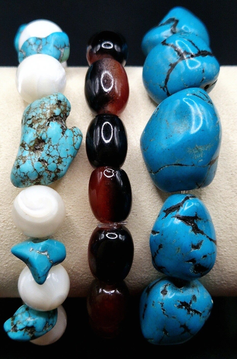 This trio creates a symbolic blend of grounding earth energy and soothing, oceanic feminine energy. Turquoise is known as a grounding stone of protection and communication, often associated with the earth and sky. Mother of pearl the 'Mothering Stone'.. carrying the gentle protective, and soothing energy of the ocean.