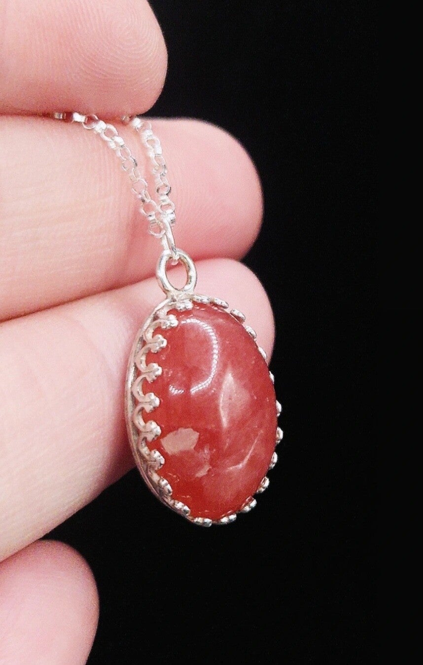 AAA rare quality very nice vibrant rhodochrosite gemstone set into a sterling silver bezel and on an 18inch silver chain.