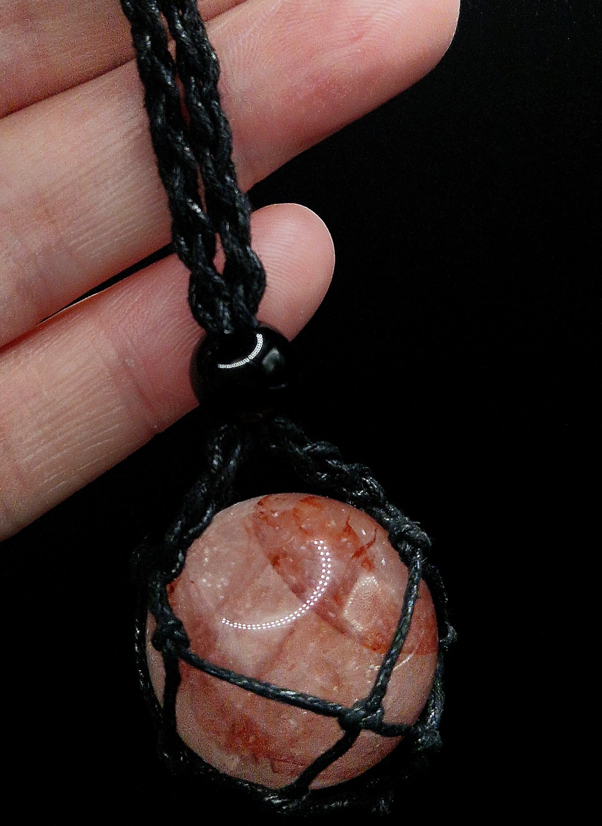 Fire quartz sphere inside macrame handmade cord which is 20inch in lenght.